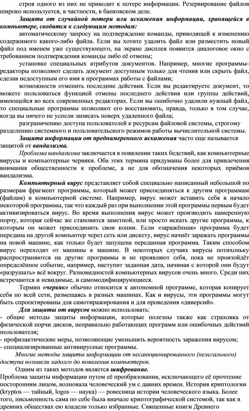 - общие методы защиты информации, которые полезны также как страховка от физической порчи дисков, неправильно работающих программ или ошибочных действий пользователя;