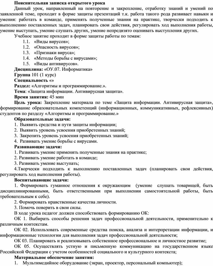 Цель урока: Закрепление материала по теме «Защита информации. Антивирусная защита», формирование образовательных компетенций (информационных, коммуникативных, рефлексивных) студентов по разделу «Алгоритмы и программирование.»