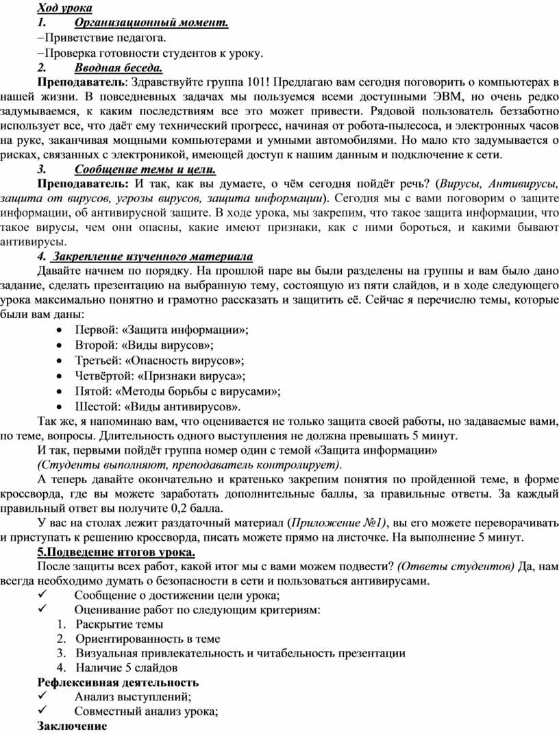Преподаватель: И так, как вы думаете, о чём сегодня пойдёт речь? (Вирусы, Антивирусы, защита от вирусов, угрозы вирусов, защита информации). Сегодня мы с вами поговорим о защите информации, об антивирусной защите. В ходе урока, мы закрепим, что такое защита информации, что такое вирусы, чем они опасны, какие имеют признаки, как с ними бороться, и какими бывают антивирусы.