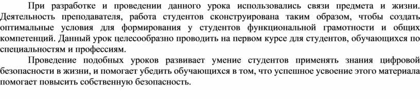 Проведение подобных уроков развивает умение студентов применять знания цифровой безопасности в жизни, и помогает убедить обучающихся в том, что успешное усвоение этого материала помогает повысить собственную безопасность.