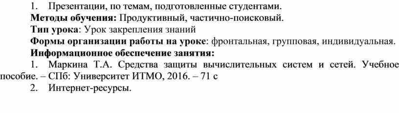 1. Маркина Т.А. Средства защиты вычислительных систем и сетей. Учебное пособие. – СПб: Университет ИТМО, 2016. – 71 с