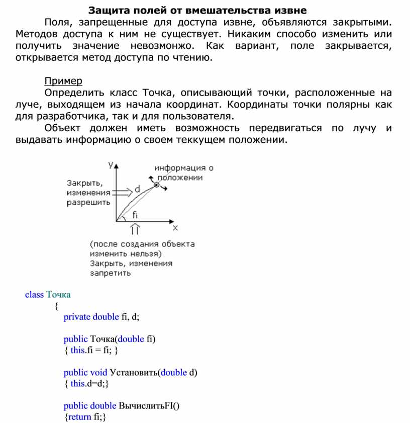 Поля, запрещенные для доступа извне, объявляются закрытыми. Методов доступа к ним не существует. Никаким способо изменить или получить значение невозмонжо. Как вариант, поле закрывается, открывается метод доступа по чтению.