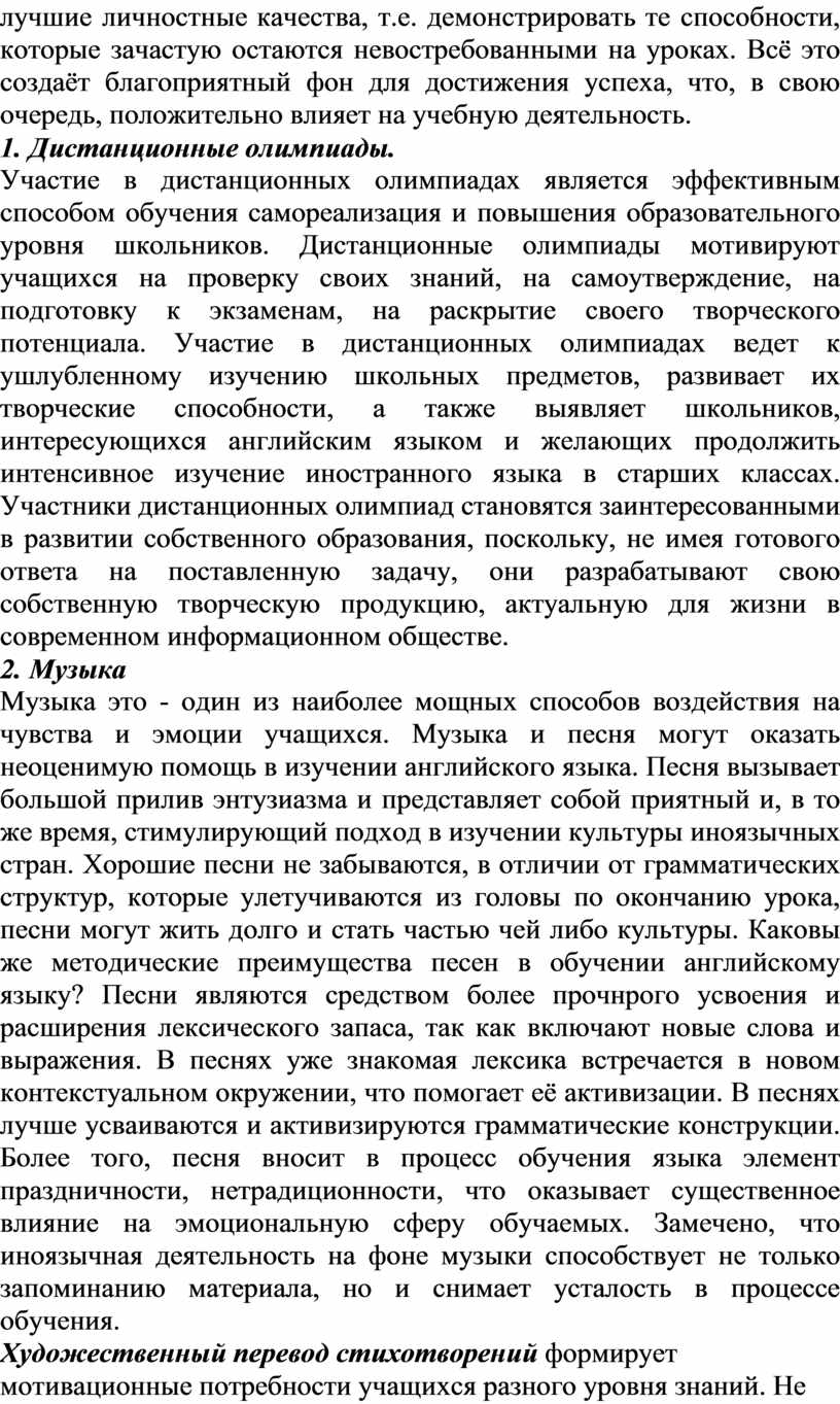 7. Художественный перевод стихотворений формирует мотивационные потребности учащихся разного уровня знаний. Не подлежит ни какому сомнению, что творческие работы повышают интерес учащихся к изучению языка. В результате работы с рифмованными текстами у школьников активизируется познавательная деятельность, что способствует их самореализации. Бесспорно, что при такой работе расширяется филологический кругозор учащихся и, соответственно, запас лексических единиц.