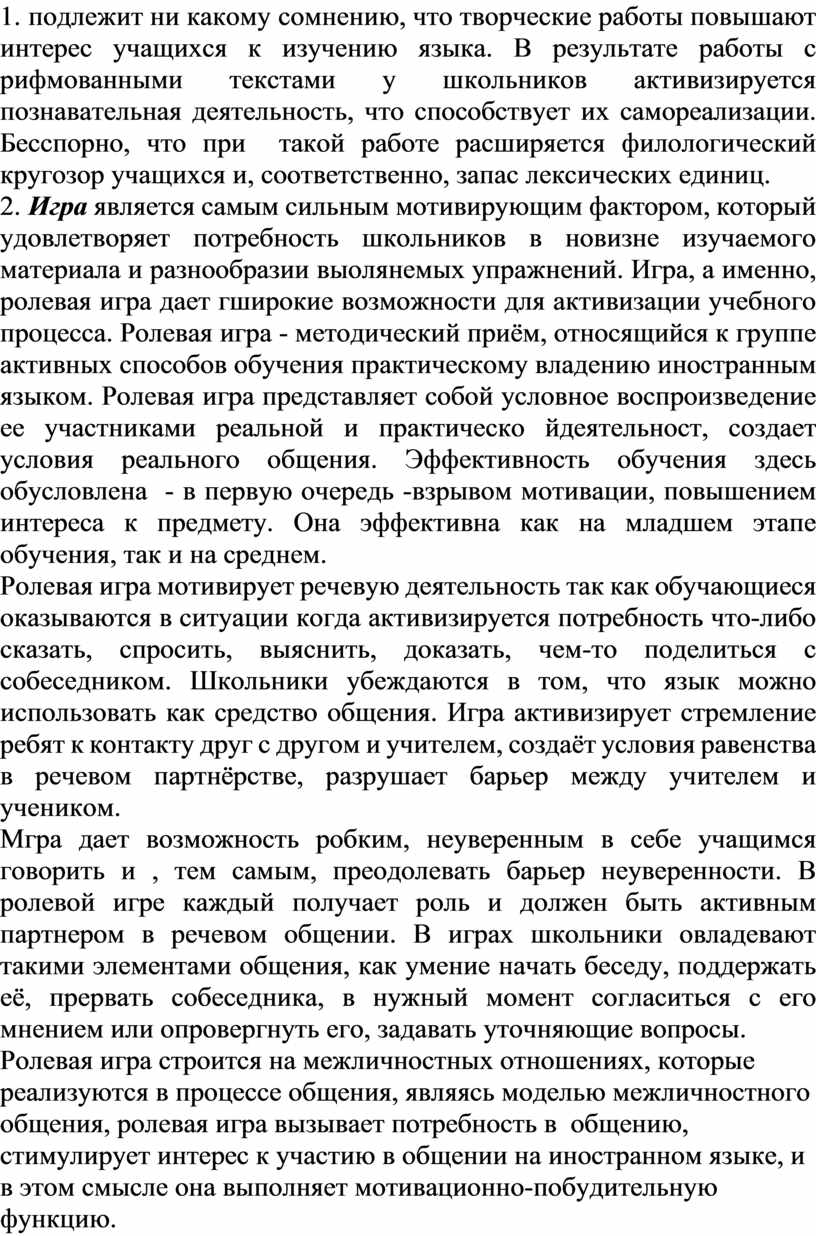 8. Игра является самым сильным мотивирующим фактором, который удовлетворяет потребность школьников в новизне изучаемого материала и разнообразии выолянемых упражнений. Игра, а именно, ролевая игра дает гширокие возможности для активизации учебного процесса. Ролевая игра - методический приём, относящийся к группе активных способов обучения практическому владению иностранным языком. Ролевая игра представляет собой условное воспроизведение ее участниками реальной и практическо йдеятельност, создает условия реального общения. Эффективность обучения здесь обусловлена - в первую очередь -взрывом мотивации, повышением интереса к предмету. Она эффективна как на младшем этапе обучения, так и на среднем.