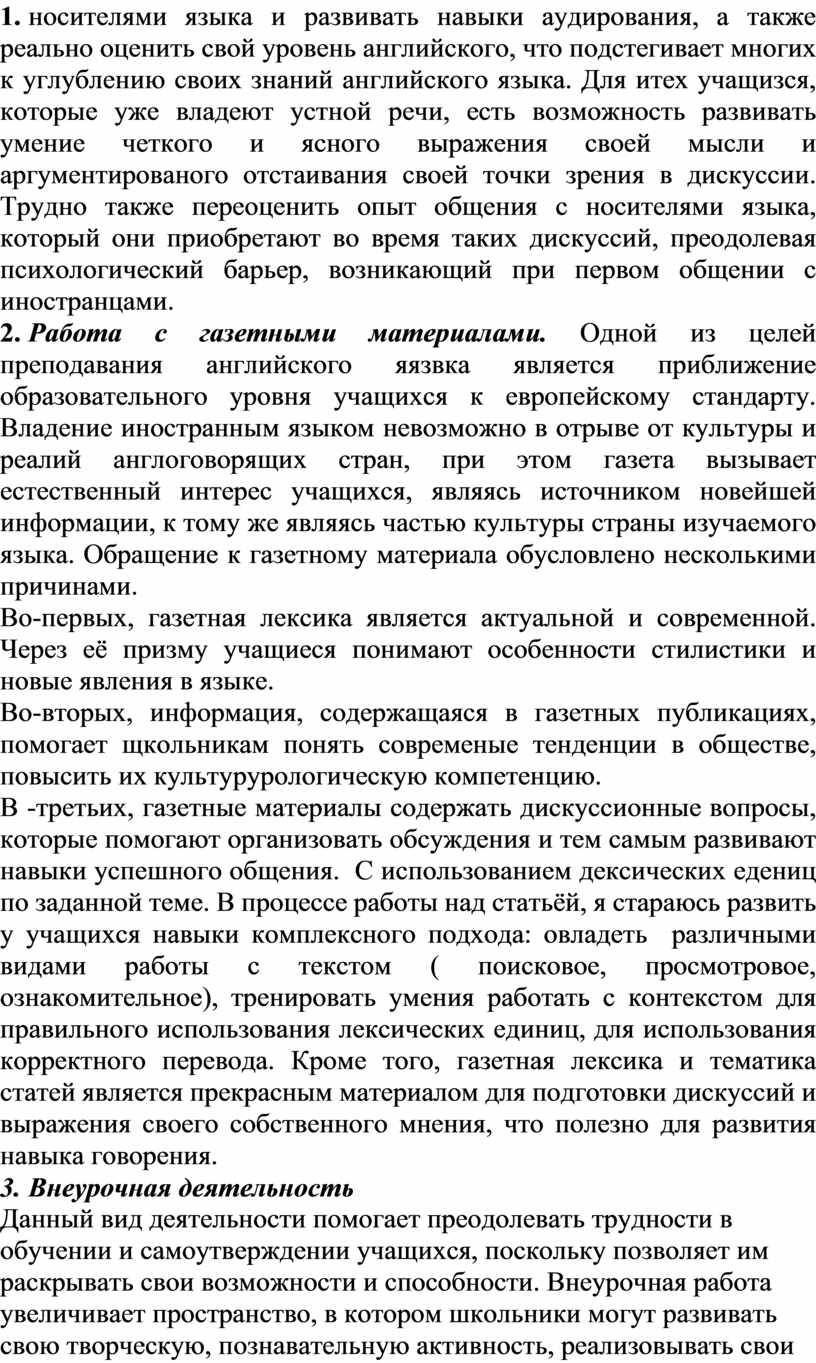 3. Работа с газетными материалами. Одной из целей преподавания английского яязвка является приближение образовательного уровня учащихся к европейскому стандарту. Владение иностранным языком невозможно в отрыве от культуры и реалий англоговорящих стран, при этом газета вызывает естественный интерес учащихся, являясь источником новейшей информации, к тому же являясь частью культуры страны изучаемого языка. Обращение к газетному материала обусловлено несколькими причинами.