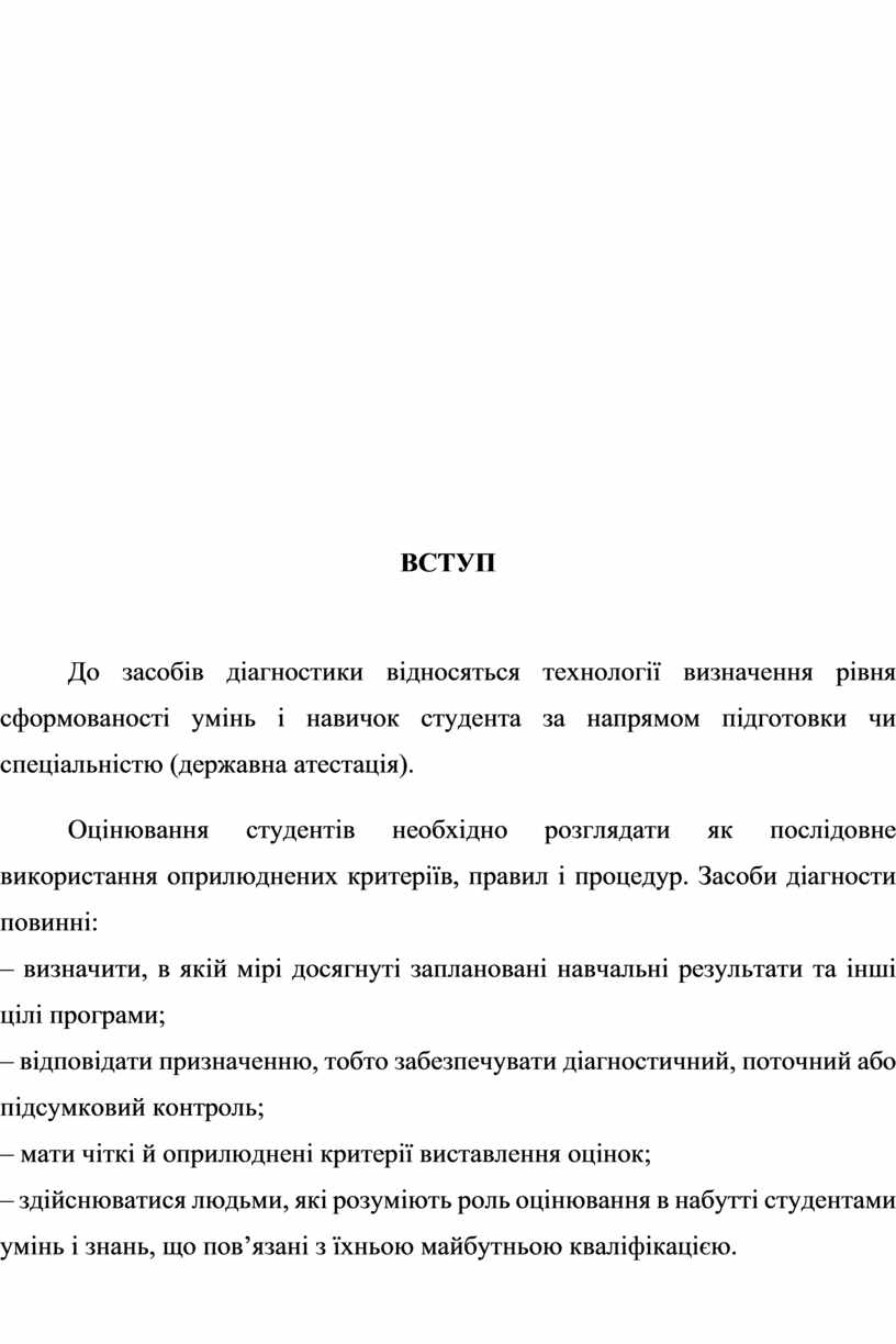 До засобів діагностики відносяться технології визначення рівня сформованості умінь і навичок студента за напрямом підготовки чи спеціальністю (державна атестація).