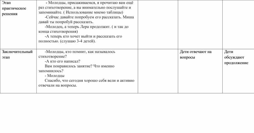 - Молодцы, присаживаемся, я прочитаю вам ещё раз стихотворение, а вы внимательно послушайте и запоминайте. ( Использование мнемо таблицы) -Сейчас давайте попробуем его рассказать. Миша давай ты попробуй рассказать. -Молодец, а теперь Лера продолжит. ( и так до конца стихотворения) -А теперь кто хочет выйти и рассказать его полностью. (слушаю 3-4 детей).