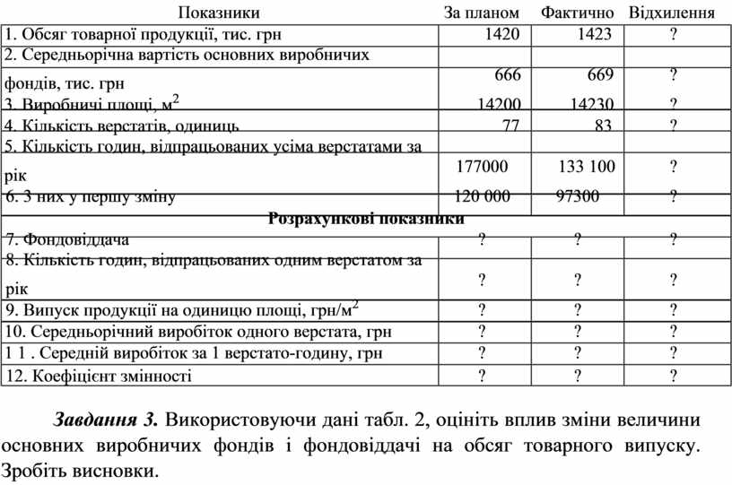 Завдання 2. Використовуючи вихідні дані табл.2, що наведена нижче, розрахуйте та проаналізуйте в динаміці зазначені в таблиці показники. Зробіть висновки про інтенсивне та екстенсивне використання основних фондів підприємства.