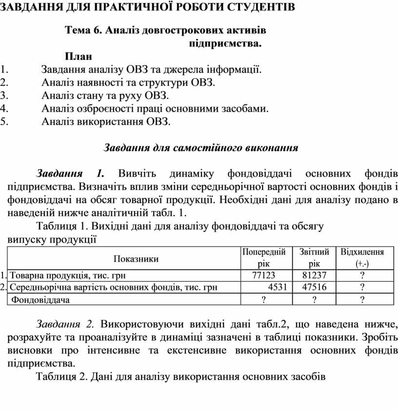Завдання 1. Вивчіть динаміку фондовіддачі основних фондів підприємства. Визначіть вплив зміни середньорічної вартості основних фондів і фондовіддачі на обсяг товарної продукції. Необхідні дані для аналізу подано в наведеній нижче аналітичній табл. 1.