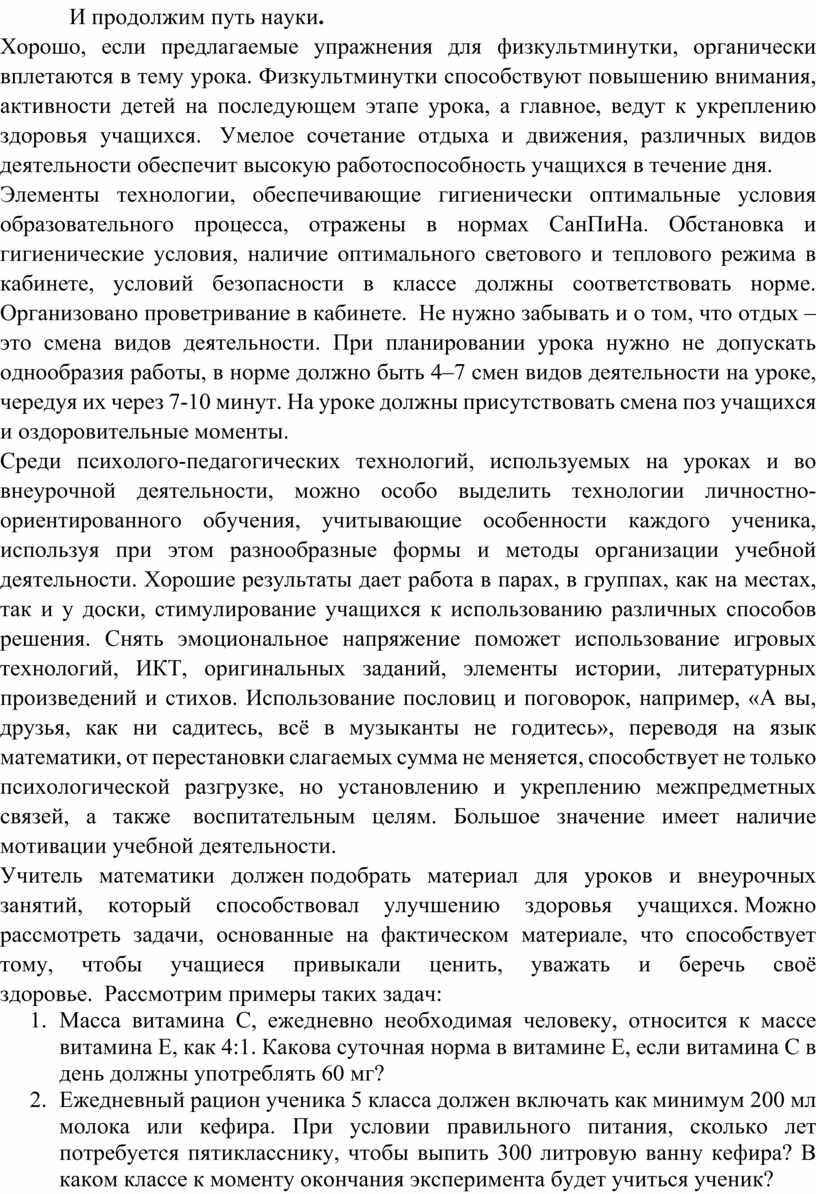 Наиболее опасным фактором для здоровья человека является его образ жизни, поэтому надо научить человека со школьных лет ответственно относиться к своему здоровью. Использование здоровьесберегающих технологий в учебном процессе позволяет учащимся более успешно адаптироваться в образовательном и социальном пространстве, раскрыть свои творческие способности, а учителю эффективно проводить профилактику асоциального поведения. Использование в преподавании математики учебного материала, который способствует улучшению здоровья учащихся и организация уроков с применением здоровьесберегающих технологий позволят не только повысить уровень знаний учащихся, но и сохранить здоровье уже на самой первой ступени обучения. Уроки математики и внеурочные мероприятия по математике могут способствовать улучшению здоровья учащихся при включении в содержание учебного материала сведений из гигиены, медицины, ОБЖ и др. и организации уроков и мероприятий с учетом факторов, влияющих на здоровье детей.