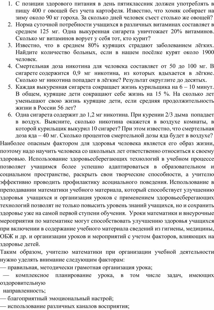 Учитель математики должен подобрать материал для уроков и внеурочных занятий, который способствовал улучшению здоровья учащихся. Можно рассмотреть задачи, основанные на фактическом материале, что способствует тому, чтобы учащиеся привыкали ценить, уважать и беречь своё здоровье. Рассмотрим примеры таких задач: