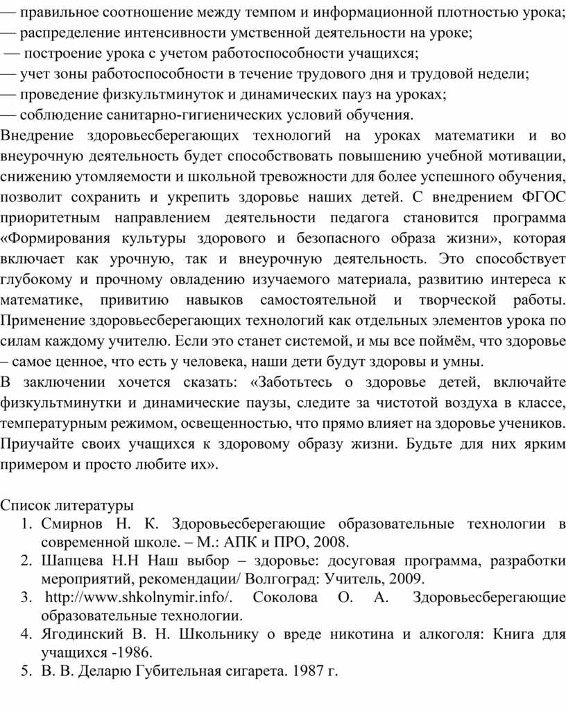 1. Смирнов Н. К. Здоровьесберегающие образовательные технологии в современной школе. – М.: АПК и ПРО, 2008.