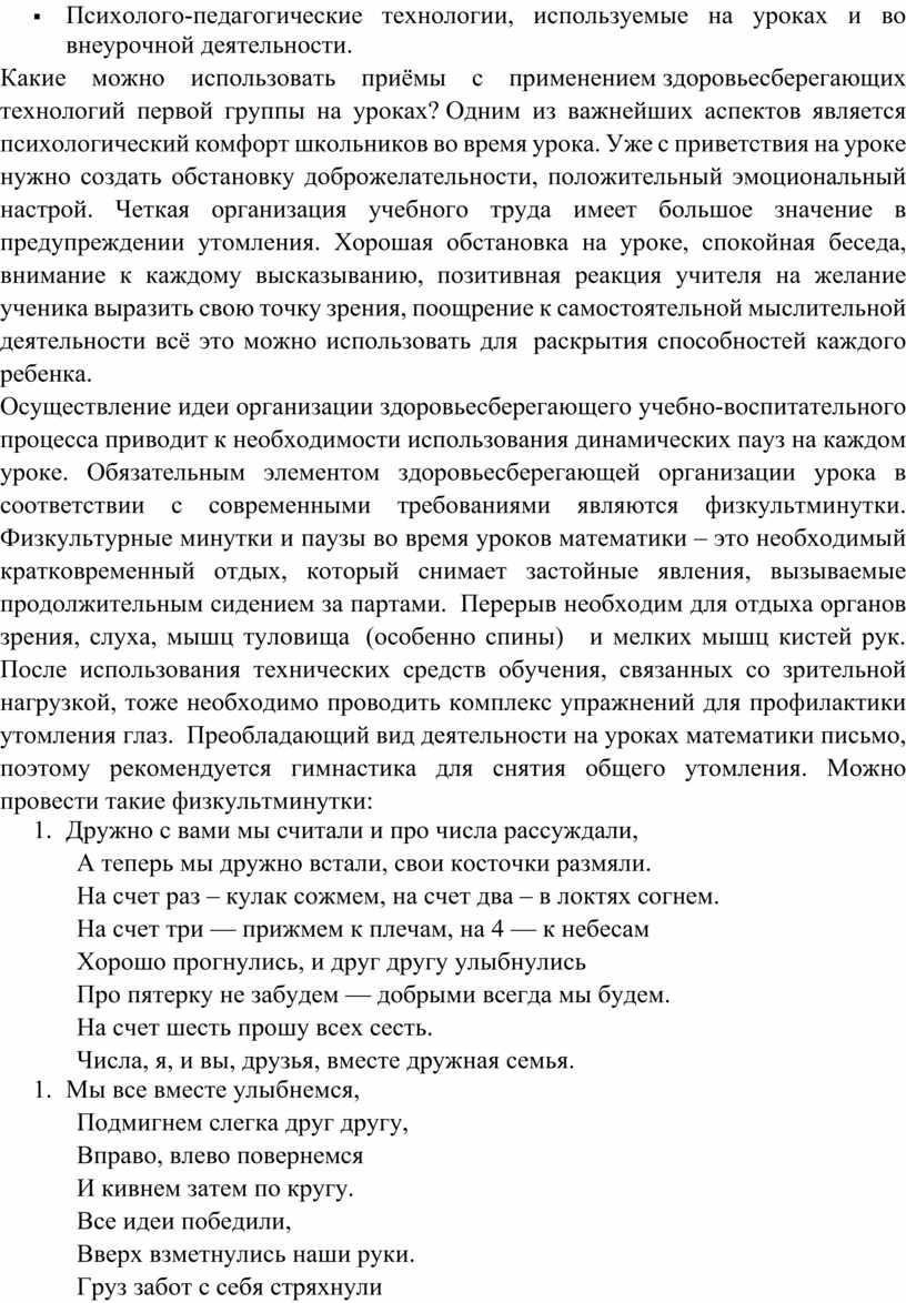 Осуществление идеи организации здоровьесберегающего учебно-воспитательного процесса приводит к необходимости использования динамических пауз на каждом уроке. Обязательным элементом здоровьесберегающей организации урока в соответствии с современными требованиями являются физкультминутки. Физкультурные минутки и паузы во время уроков математики – это необходимый кратковременный отдых, который снимает застойные явления, вызываемые продолжительным сидением за партами. Перерыв необходим для отдыха органов зрения, слуха, мышц туловища (особенно спины) и мелких мышц кистей рук. После использования технических средств обучения, связанных со зрительной нагрузкой, тоже необходимо проводить комплекс упражнений для профилактики утомления глаз. Преобладающий вид деятельности на уроках математики письмо, поэтому рекомендуется гимнастика для снятия общего утомления. Можно провести такие физкультминутки:
