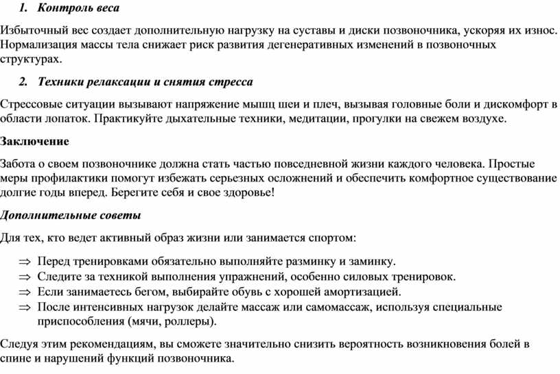 Избыточный вес создает дополнительную нагрузку на суставы и диски позвоночника, ускоряя их износ. Нормализация массы тела снижает риск развития дегенеративных изменений в позвоночных структурах.