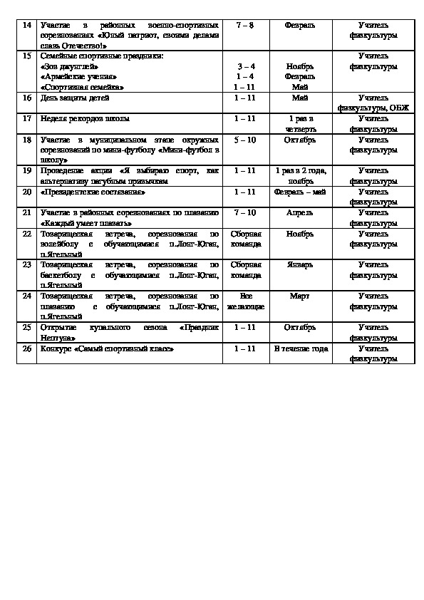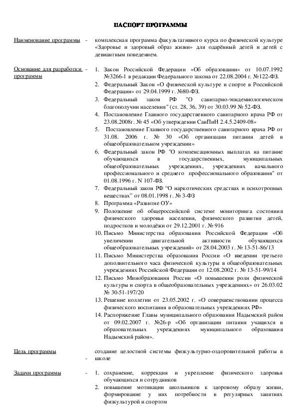 14. Распоряжение Главы муниципального образования Надымский район от 09.02.2007 г. №26-р «Об организации питания учащихся в образовательных учреждениях муниципального образования Надымский район».комплексная программа факультативного курса по физической культуре «Здоровье и здоровый образ жизни» для одарённый детей и детей с девиантным поведением.