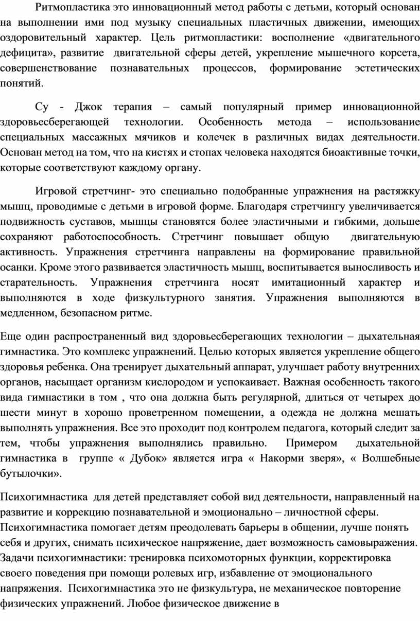 1. Технология сохранении и стимулирования здоровья: физкультурные минутки(динамичные паузы), ритмопластика, гимнастика для глаз, дыхательная гимнастика, игровой стретчинг.