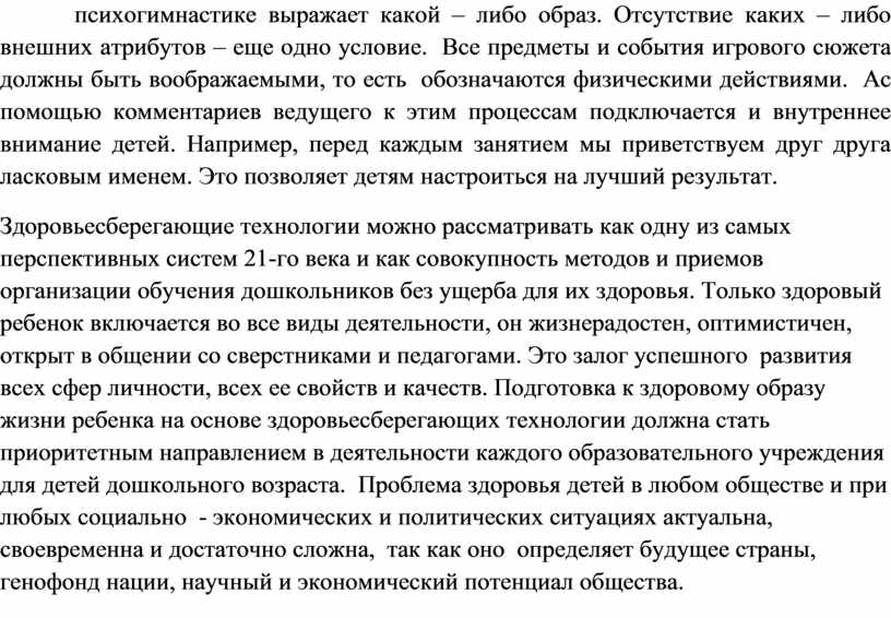 Здоровьесберегающие технологии можно рассматривать как одну из самых перспективных систем 21-го века и как совокупность методов и приемов организации обучения дошкольников без ущерба для их здоровья. Только здоровый ребенок включается во все виды деятельности, он жизнерадостен, оптимистичен, открыт в общении со сверстниками и педагогами. Это залог успешного развития всех сфер личности, всех ее свойств и качеств. Подготовка к здоровому образу жизни ребенка на основе здоровьесберегающих технологии должна стать приоритетным направлением в деятельности каждого образовательного учреждения для детей дошкольного возраста. Проблема здоровья детей в любом обществе и при любых социально - экономических и политических ситуациях актуальна, своевременна и достаточно сложна, так как оно определяет будущее страны, генофонд нации, научный и экономический потенциал общества.