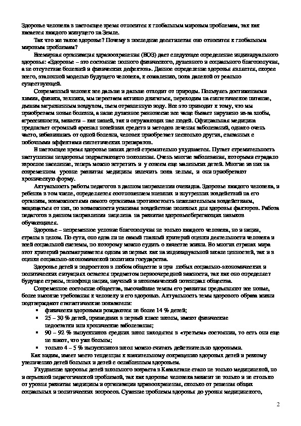 Ж. Ж. РуссоЗдоровье человека в настоящее время относится к глобальным мировым проблемам, так как