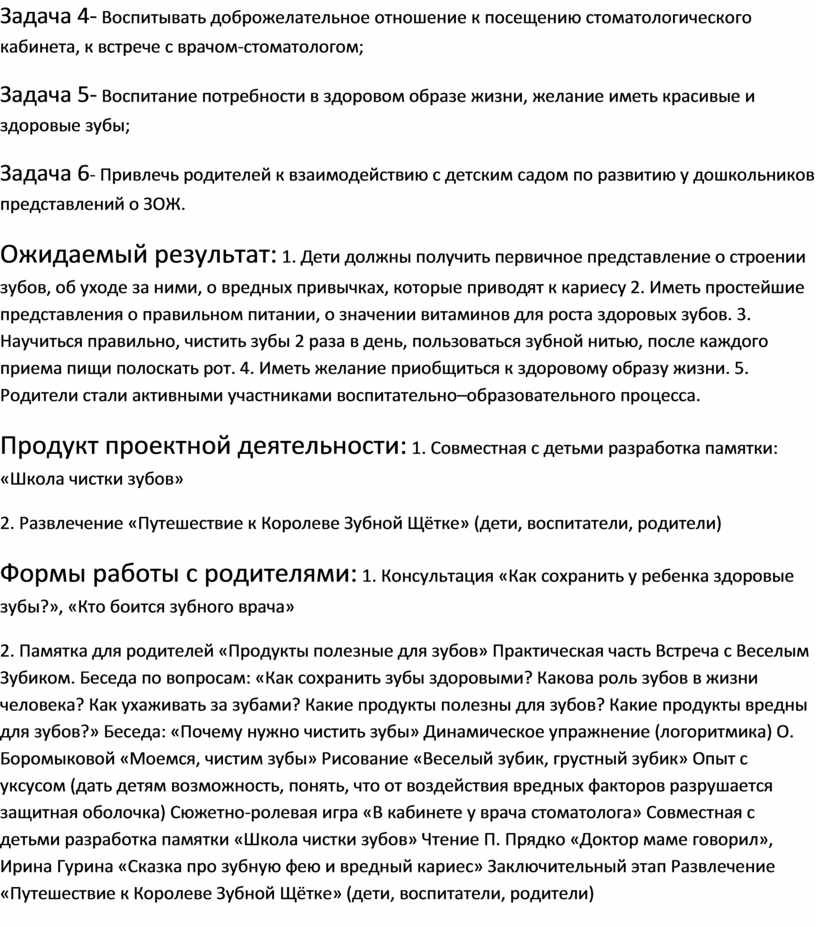 2. Памятка для родителей «Продукты полезные для зубов» Практическая часть Встреча с Веселым Зубиком. Беседа по вопросам: «Как сохранить зубы здоровыми? Какова роль зубов в жизни человека? Как ухаживать за зубами? Какие продукты полезны для зубов? Какие продукты вредны для зубов?» Беседа: «Почему нужно чистить зубы» Динамическое упражнение (логоритмика) О. Боромыковой «Моемся, чистим зубы» Рисование «Веселый зубик, грустный зубик» Опыт с уксусом (дать детям возможность, понять, что от воздействия вредных факторов разрушается защитная оболочка) Сюжетно-ролевая игра «В кабинете у врача стоматолога» Совместная с детьми разработка памятки «Школа чистки зубов» Чтение П. Прядко «Доктор маме говорил», Ирина Гурина «Сказка про зубную фею и вредный кариес» Заключительный этап Развлечение «Путешествие к Королеве Зубной Щётке» (дети, воспитатели, родители)