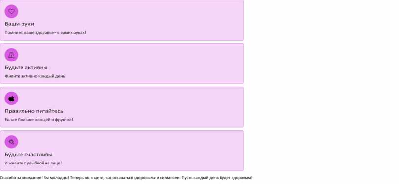 Спасибо за внимание! Вы молодцы! Теперь вы знаете, как оставаться здоровыми и сильными. Пусть каждый день будет здоровым!