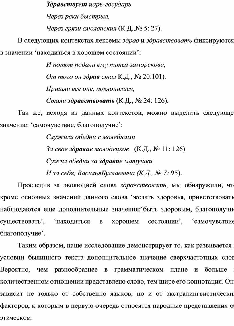 Таким образом, наше исследование демонстрирует то, как развивается в условии былинного текста дополнительное значение сверхчастотных слов. Вероятно, чем разнообразнее в грамматическом плане и больше в количественном отношении представлено слово, тем шире его коннотация. Она зависит не только от собственно языков, но и от экстралингвистических факторов, к которым в первую очередь относятся народные представления об этическом.