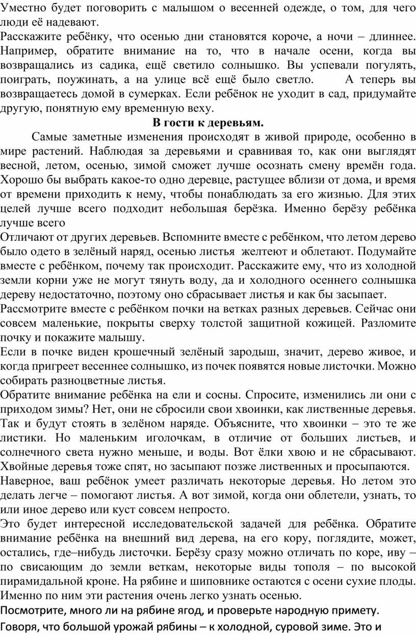 Самые заметные изменения происходят в живой природе, особенно в мире растений. Наблюдая за деревьями и сравнивая то, как они выглядят весной, летом, осенью, зимой сможет лучше осознать смену времён года. Хорошо бы выбрать какое-то одно деревце, растущее вблизи от дома, и время от времени приходить к нему, чтобы понаблюдать за его жизнью. Для этих целей лучше всего подходит небольшая берёзка. Именно берёзу ребёнка лучше всего