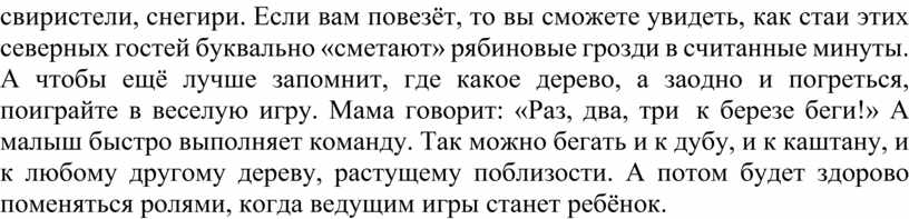 А чтобы ещё лучше запомнит, где какое дерево, а заодно и погреться, поиграйте в веселую игру. Мама говорит: «Раз, два, три к березе беги!» А малыш быстро выполняет команду. Так можно бегать и к дубу, и к каштану, и к любому другому дереву, растущему поблизости. А потом будет здорово поменяться ролями, когда ведущим игры станет ребёнок.