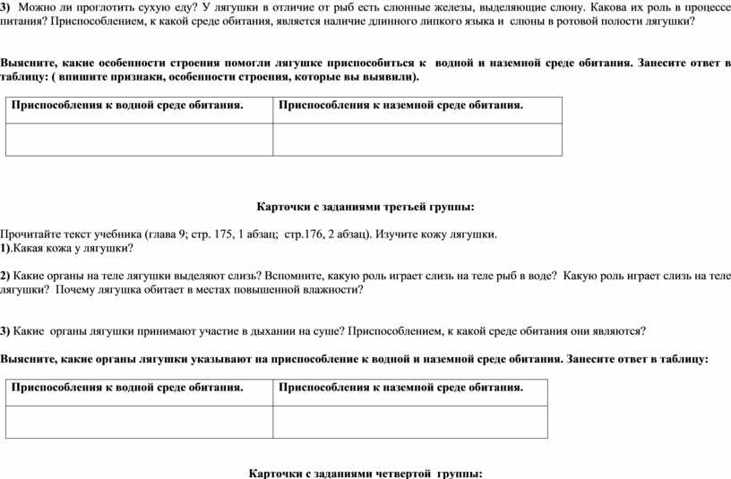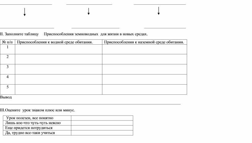 II. Заполните таблицу Приспособления земноводных для жизни в новых средах.