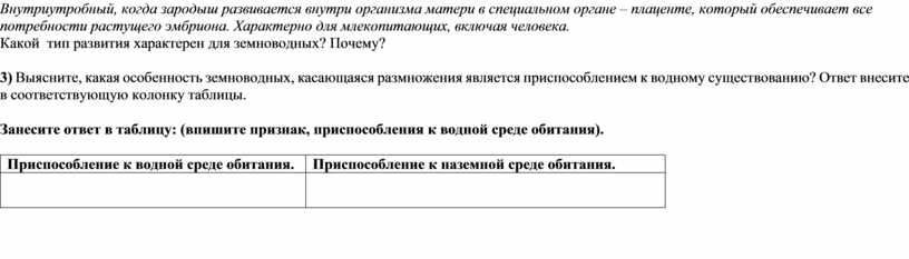 3) Выясните, какая особенность земноводных, касающаяся размножения является приспособлением к водному существованию? Ответ внесите в соответствующую колонку таблицы.