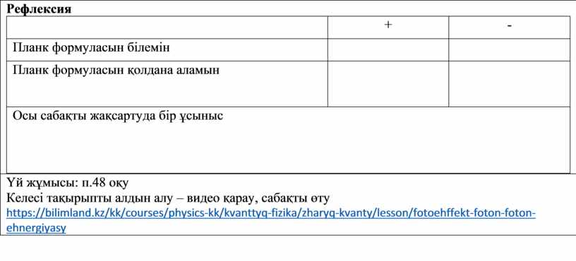 Үй жұмысы: п.48 оқу Келесі тақырыпты алдын алу – видео қарау, сабақты өту https://bilimland.kz/kk/courses/physics-kk/kvanttyq-fizika/zharyq-kvanty/lesson/fotoehffekt-foton-foton-ehnergiyasy |