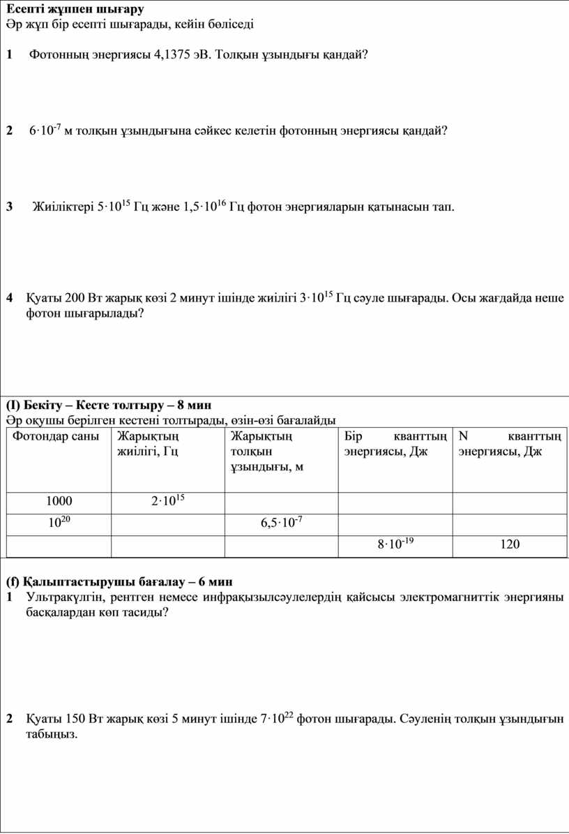 Пәндік лексика және терминология: Жарық, квант, энергия, фотон, жиілік Свет, квант, энергия, фотон, частота Light, quantum, energy, photon, frequency Диалогқа/жазуға қажетті сөз тіркестері: Сәуле арқылы тарайтын немесе жұтылатын бір үлес энергия квант деп аталады. Абсолют қара дене энергияны үздікті шығарады және жұтады. Квант – порция энергии при распространении и поглощении. Абсолютно черное тело выделяет и поглощает энергию прерывно, отдельными порциями (квантами). Quantum - a portion of the energy during propagation and absorption. An absolutely black body releases and absorbs energy intermittently, in separate portions (quanta). |