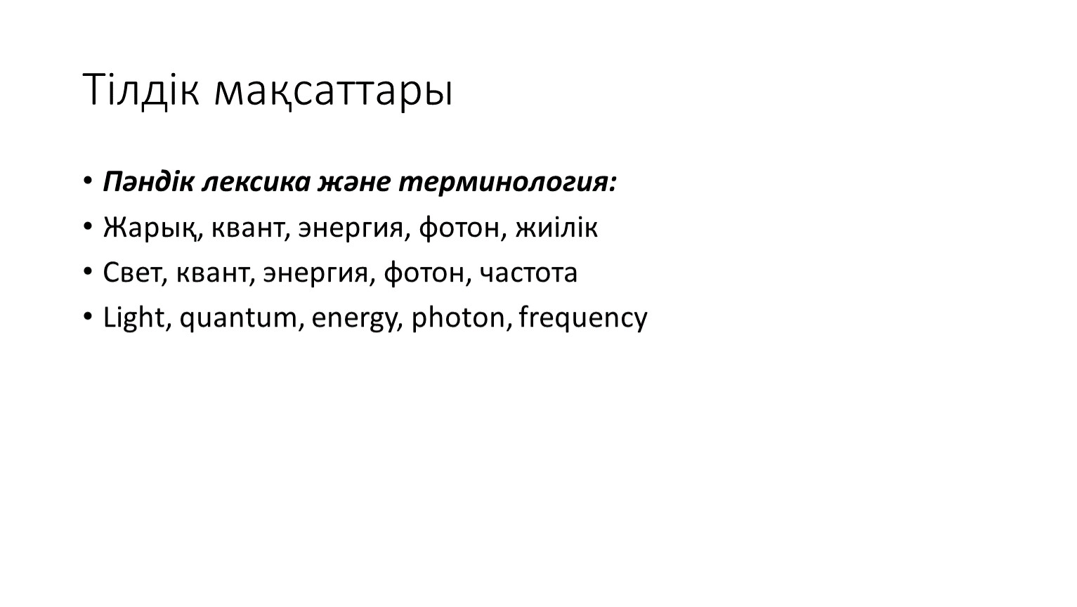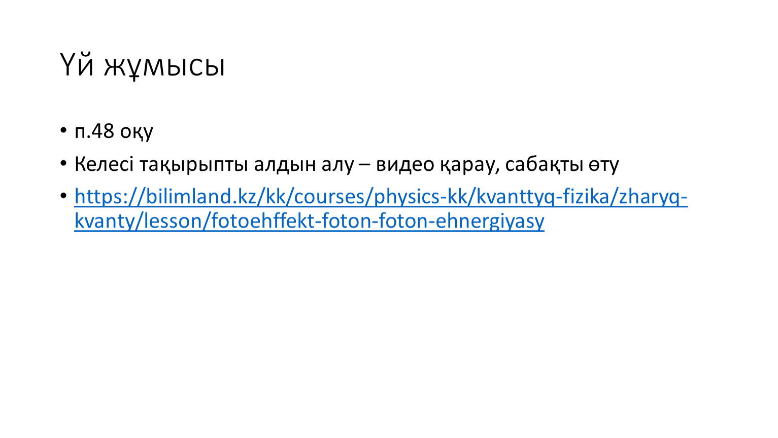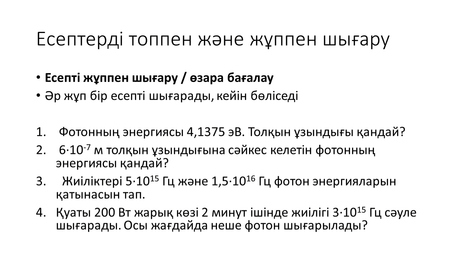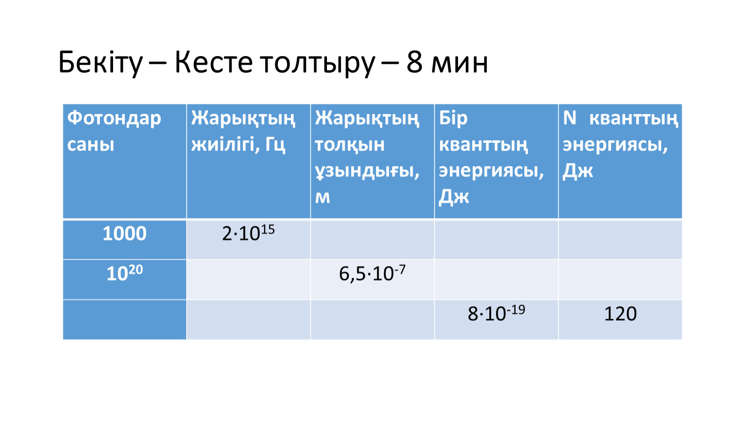 Фотондар саны | Жарықтың жиілігі, Гц | Жарықтың толқын ұзындығы, м | Бір кванттың энергиясы, Дж | N кванттың энергиясы, Дж |