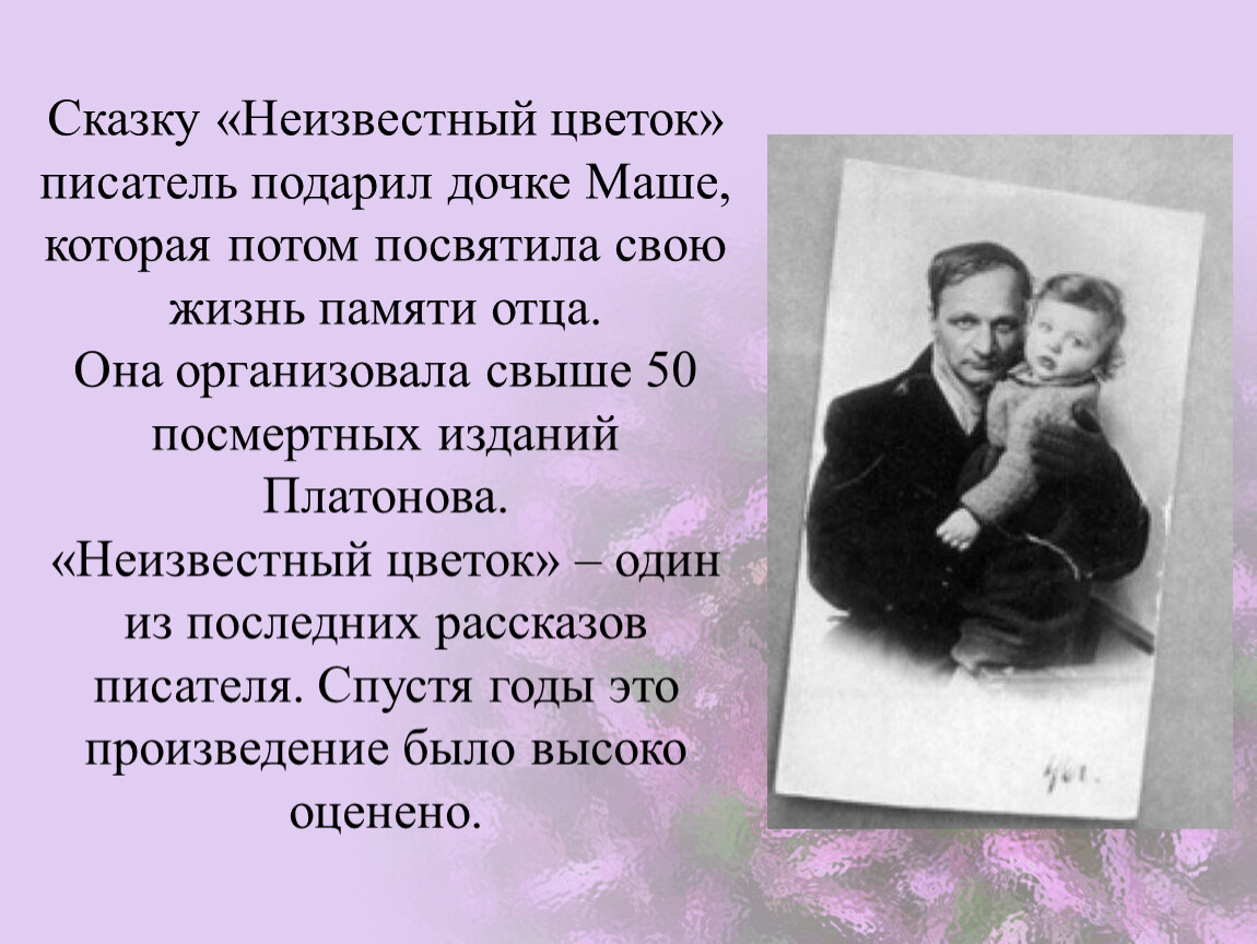 Сказку «Неизвестный цветок» писатель подарил дочке Маше, которая потом посвятила свою жизнь памяти отца. Она организовала свыше 50 посмертных изданий Платонова.«Неизвестный цветок» – один из последних рассказов писателя. Спустя годы это произведение было высоко оценено.