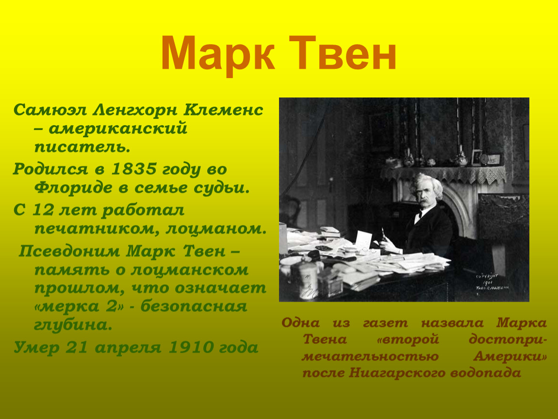 Псевдоним Марк Твен – память о лоцманском прошлом, что означает «мерка 2» - безопасная глубина.