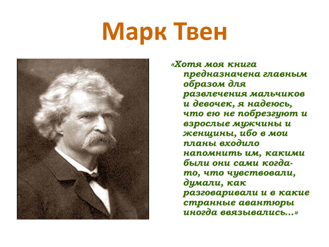 «Хотя моя книга предназначена главным образом для развлечения мальчиков и девочек, я надеюсь, что ею не побрезгуют и взрослые мужчины и женщины, ибо в мои планы входило напомнить им, какими были они сами когда-то, что чувствовали, думали, как разговаривали и в какие странные авантюры иногда ввязывались…»