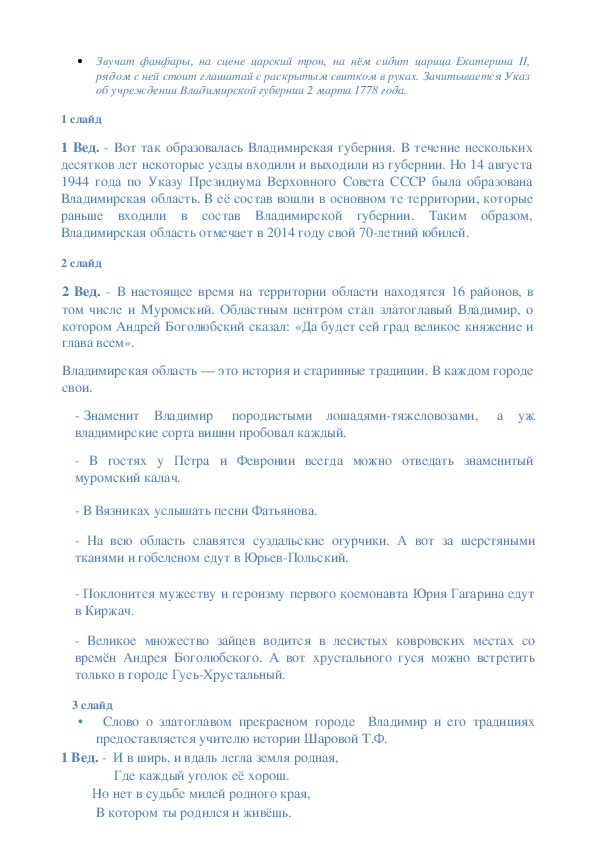 1 Вед. Вот так образовалась Владимирская губерния. В течение нескольких