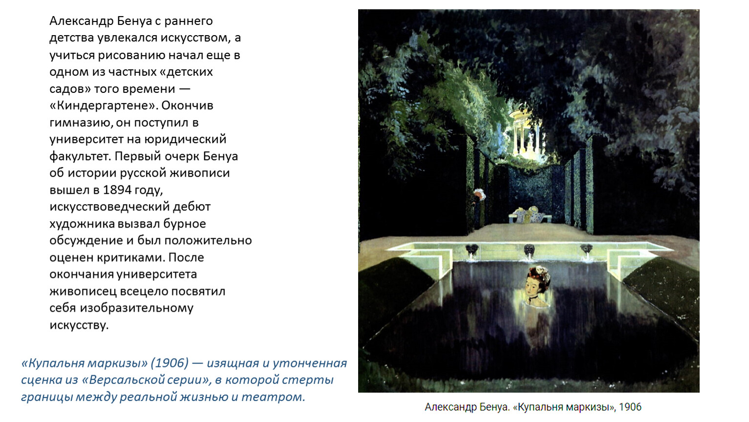 Александр Бенуа с раннего детства увлекался искусством, а учиться рисованию начал еще в одном из частных «детских садов» того времени — «Киндергартене». Окончив гимназию, он поступил в университет на юридический факультет. Первый очерк Бенуа об истории русской живописи вышел в 1894 году, искусствоведческий дебют художника вызвал бурное обсуждение и был положительно оценен критиками. После окончания университета живописец всецело посвятил себя изобразительному искусству.