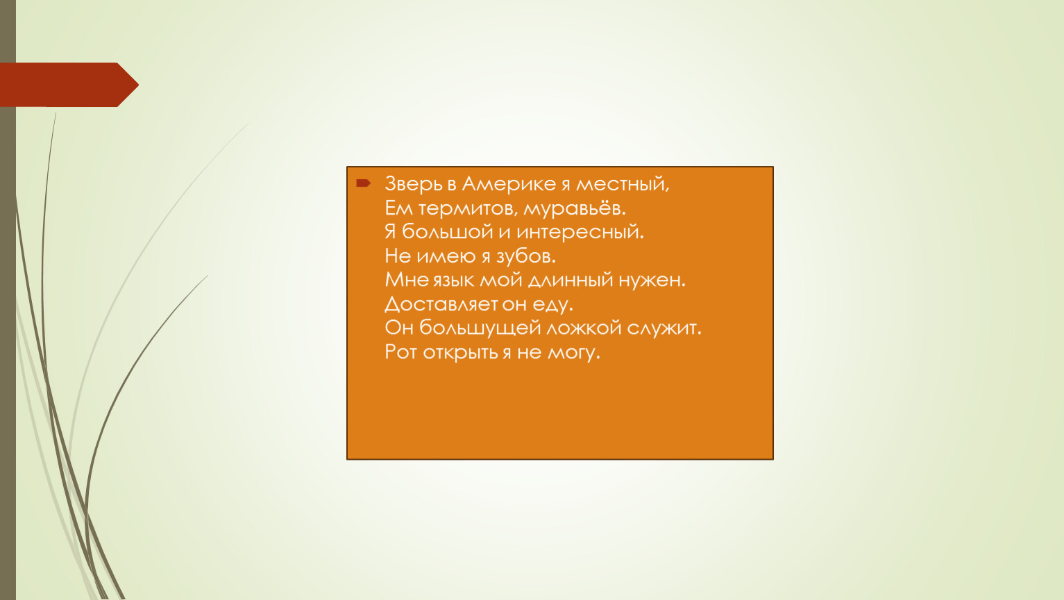 Зверь в Америке я местный,Ем термитов, муравьёв.Я большой и интересный.Не имею я зубов.Мне язык мой длинный нужен.Доставляет он еду.Он большущей ложкой служит.Рот открыть я не могу.