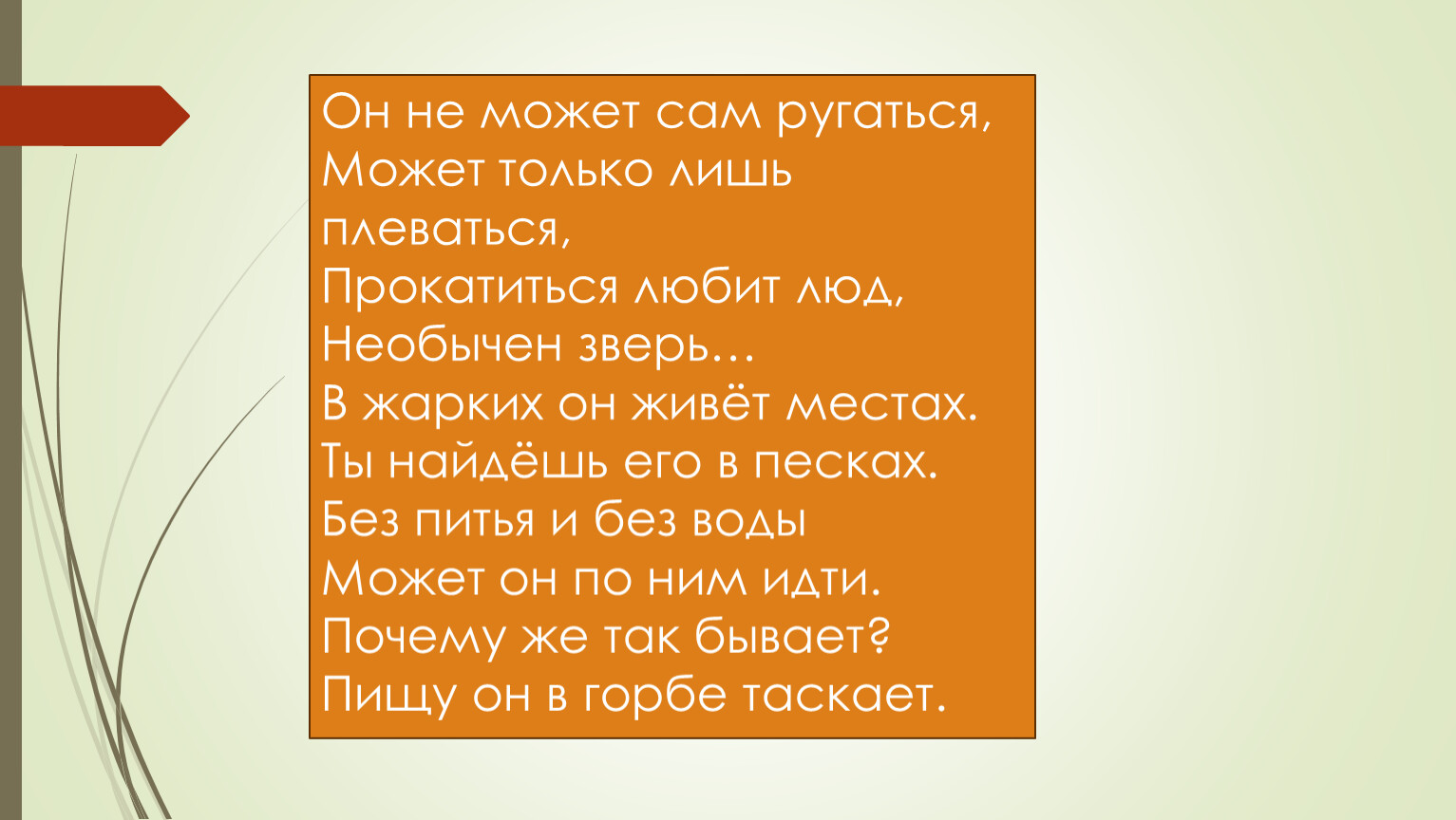 Он не может сам ругаться,Может только лишь плеваться,Прокатиться любит люд,Необычен зверь…В жарких он живёт местах.Ты найдёшь его в песках.Без питья и без водыМожет он по ним идти.Почему же так бывает?Пищу он в горбе таскает.
