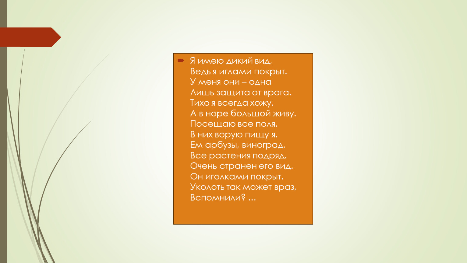 Я имею дикий вид,Ведь я иглами покрыт.У меня они – однаЛишь защита от врага.Тихо я всегда хожу,А в норе большой живу.Посещаю все поля.В них ворую пищу я.Ем арбузы, виноград,Все растения подряд.Очень странен его вид.Он иголками покрыт.Уколоть так может враз,Вспомнили? …