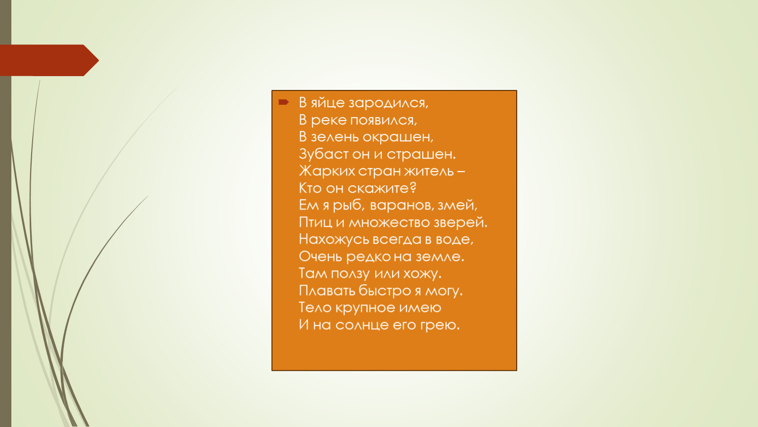 В яйце зародился,В реке появился,В зелень окрашен,Зубаст он и страшен.Жарких стран житель –Кто он скажите?Ем я рыб, варанов, змей,Птиц и множество зверей.Нахожусь всегда в воде, Очень редко на земле.Там ползу или хожу.Плавать быстро я могу.Тело крупное имеюИ на солнце его грею.
