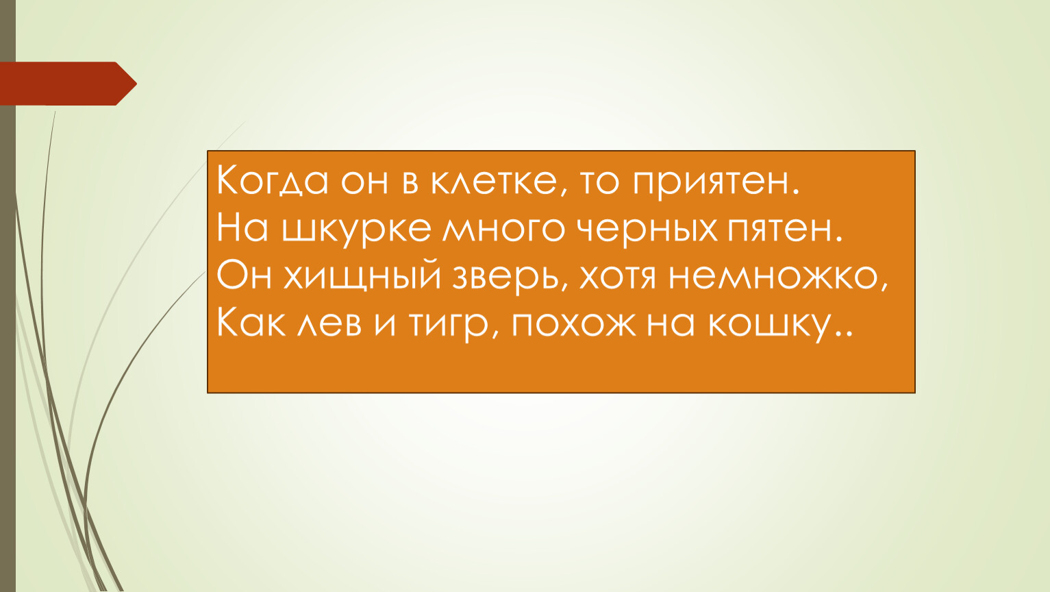 Когда он в клетке, то приятен.На шкурке много черных пятен.Он хищный зверь, хотя немножко,Как лев и тигр, похож на кошку..