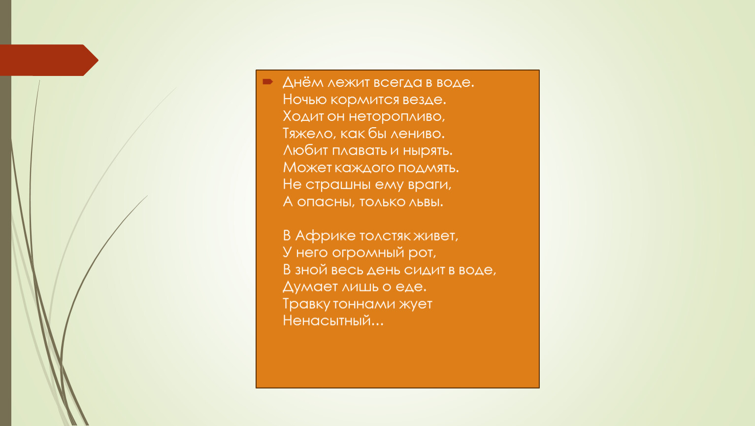 Днём лежит всегда в воде.Ночью кормится везде.Ходит он неторопливо,Тяжело, как бы лениво.Любит плавать и нырять.Может каждого подмять.Не страшны ему враги,А опасны, только львы. В Африке толстяк живет,У него огромный рот,В зной весь день сидит в воде,Думает лишь о еде.Травку тоннами жуетНенасытный…