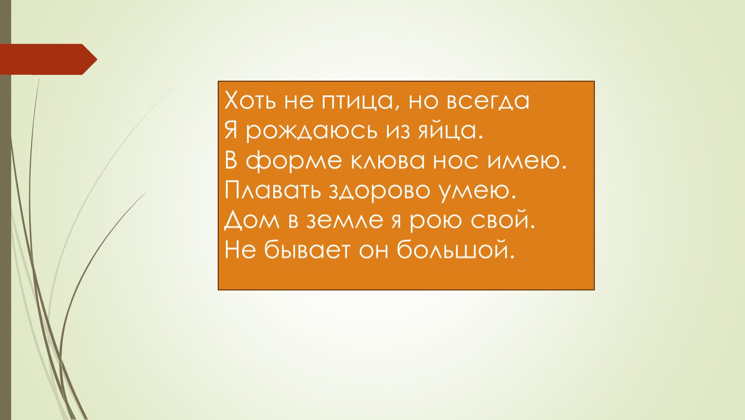 Хоть не птица, но всегдаЯ рождаюсь из яйца.В форме клюва нос имею.Плавать здорово умею.Дом в земле я рою свой.Не бывает он большой.