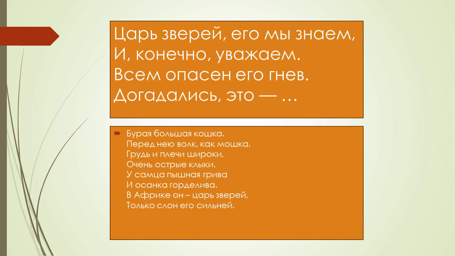 Бурая большая кошка.Перед нею волк, как мошка.Грудь и плечи широки,Очень острые клыки.У самца пышная гриваИ осанка горделива.В Африке он – царь зверей,Только слон его сильней.