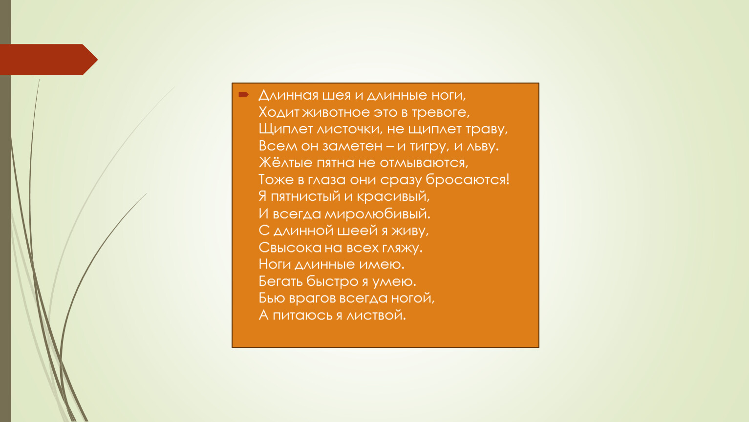 Длинная шея и длинные ноги,Ходит животное это в тревоге,Щиплет листочки, не щиплет траву,Всем он заметен – и тигру, и льву.Жёлтые пятна не отмываются,Тоже в глаза они сразу бросаются!Я пятнистый и красивый,И всегда миролюбивый.С длинной шеей я живу,Свысока на всех гляжу.Ноги длинные имею.Бегать быстро я умею.Бью врагов всегда ногой,А питаюсь я листвой.