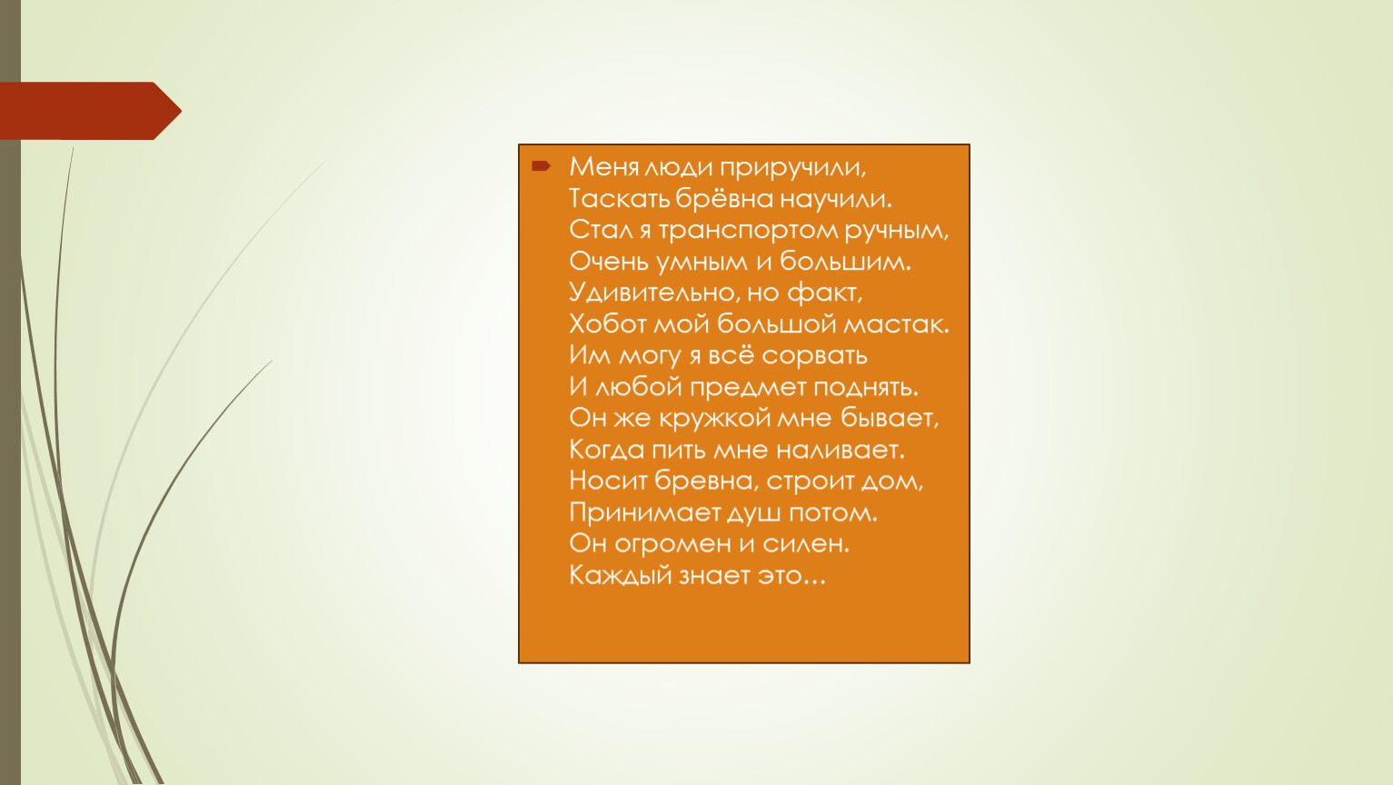 Меня люди приручили,Таскать брёвна научили.Стал я транспортом ручным,Очень умным и большим.Удивительно, но факт,Хобот мой большой мастак.Им могу я всё сорватьИ любой предмет поднять.Он же кружкой мне бывает,Когда пить мне наливает.Носит бревна, строит дом,Принимает душ потом.Он огромен и силен.Каждый знает это…