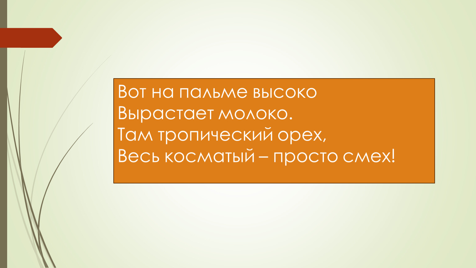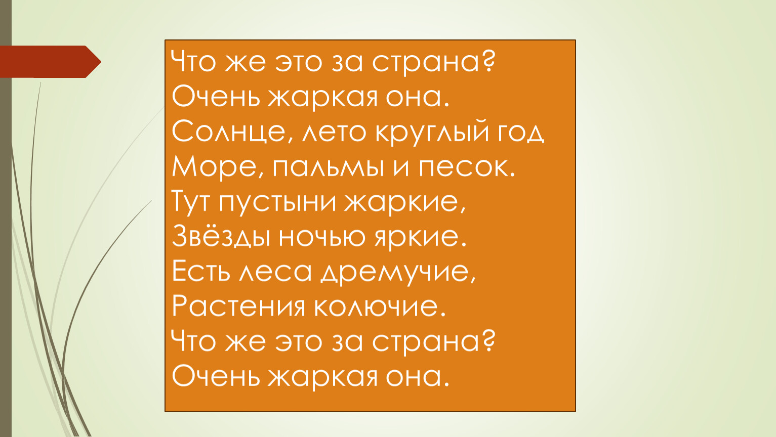 Что же это за страна?Очень жаркая она.Солнце, лето круглый годМоре, пальмы и песок.Тут пустыни жаркие,Звёзды ночью яркие.Есть леса дремучие,Растения колючие.Что же это за страна?Очень жаркая она.