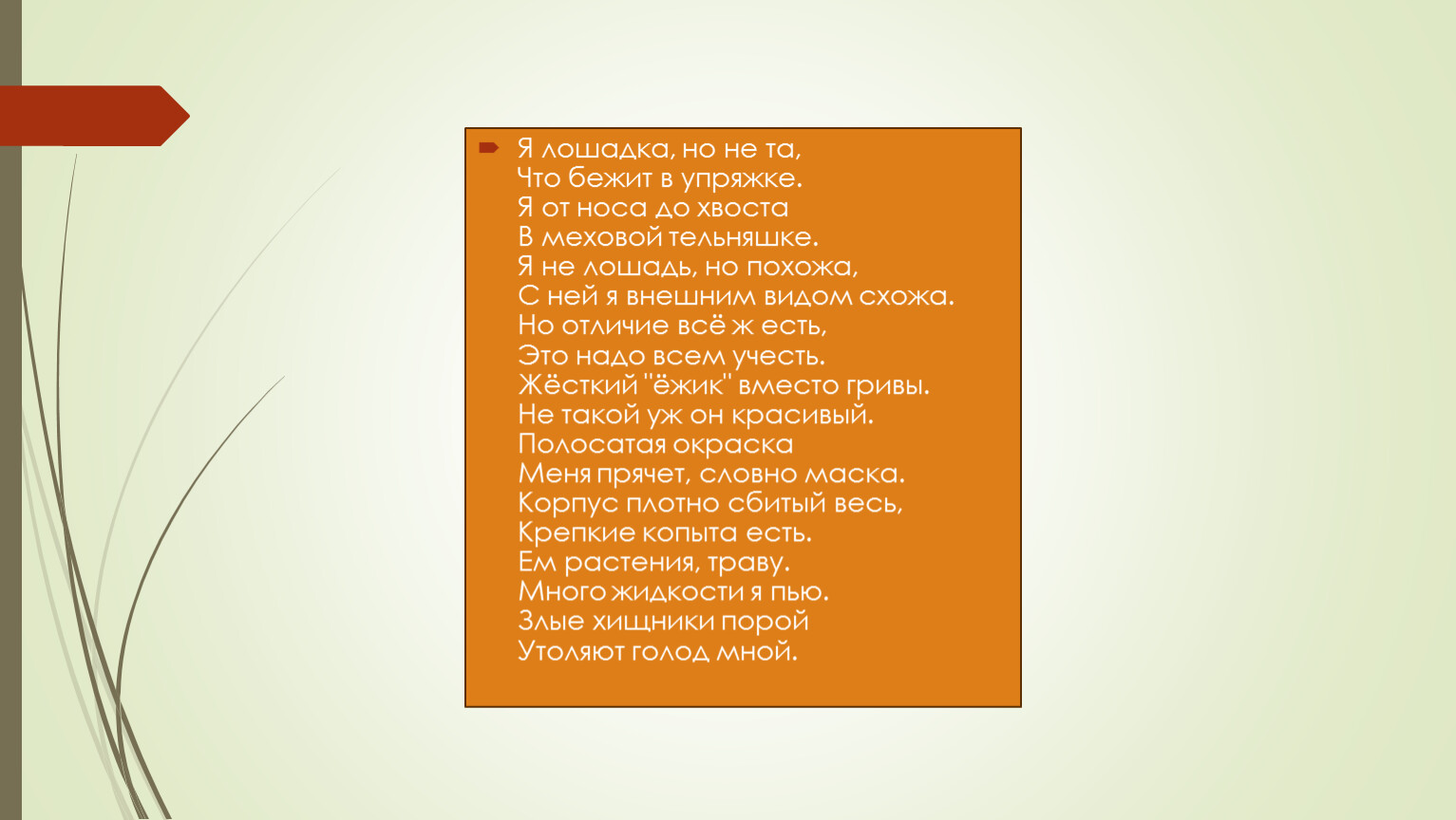 Я лошадка, но не та,Что бежит в упряжке.Я от носа до хвостаВ меховой тельняшке.Я не лошадь, но похожа,С ней я внешним видом схожа.Но отличие всё ж есть,Это надо всем учесть.Жёсткий "ёжик" вместо гривы.Не такой уж он красивый.Полосатая окраскаМеня прячет, словно маска.Корпус плотно сбитый весь,Крепкие копыта есть.Ем растения, траву.Много жидкости я пью.Злые хищники поройУтоляют голод мной.