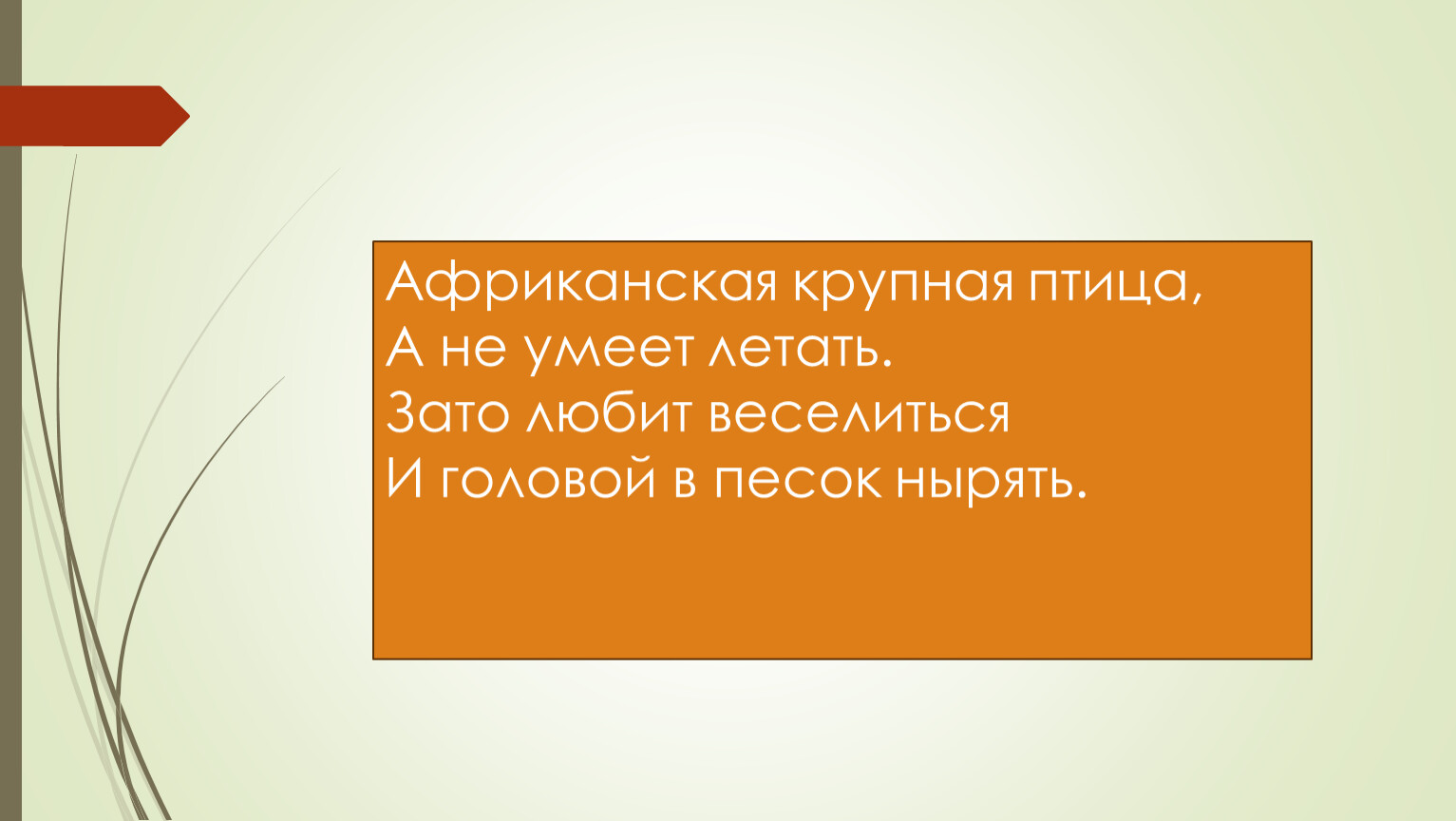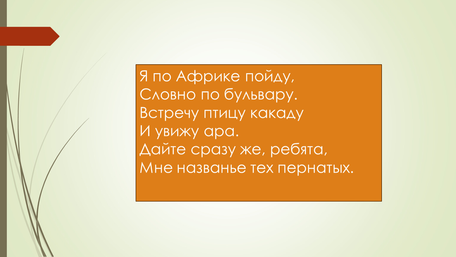 Я по Африке пойду,Словно по бульвару.Встречу птицу какадуИ увижу ара.Дайте сразу же, ребята,Мне названье тех пернатых.